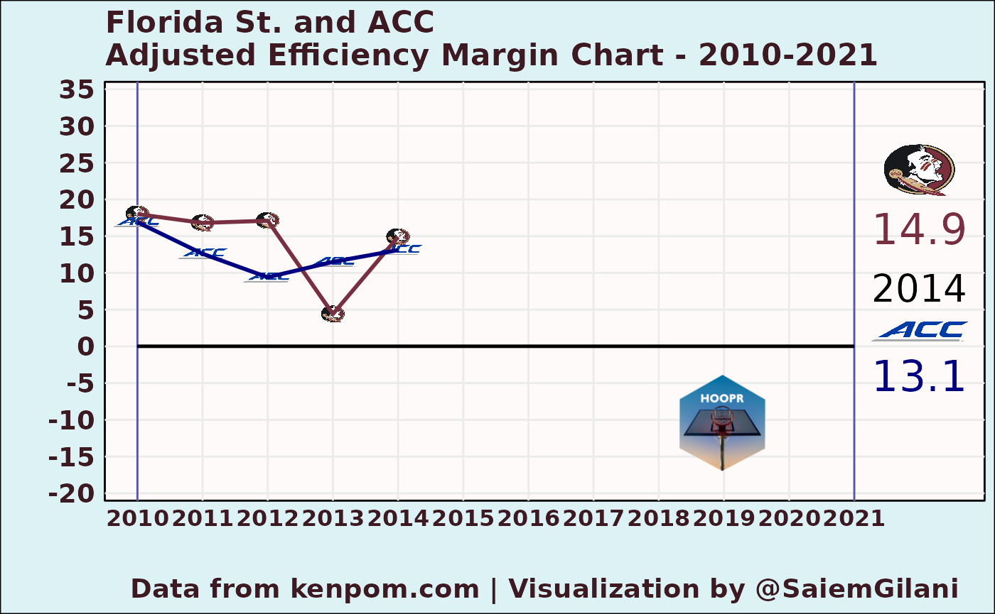 So in this vignette, we’re going to plot something simple first to get a sense of how we would compare different metrics and groups. In this example, we are going to compare Florida State’s adjusted efficiency margin (AdjEM) over the past ten years and the ACC conference average.